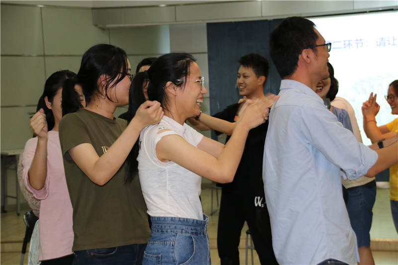 活動(dòng)在勵(lì)志歌曲“追夢赤子心”的音樂聲中拉開序幕。大家在指導(dǎo)老師的引領(lǐng)下,分成二個(gè)小組共同進(jìn)入“大風(fēng)吹”“請讓我為你按摩一下下”“優(yōu)點(diǎn)轟炸”“銜紙杯傳水”